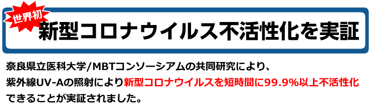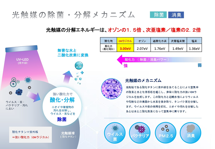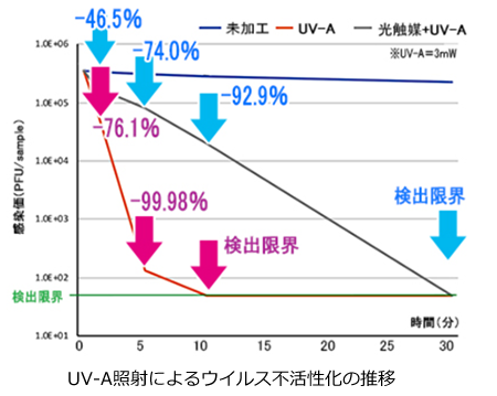 ※図において、光触媒の表面ではUV-A照射によって効果的にウイルスが除去されている事が分かります。