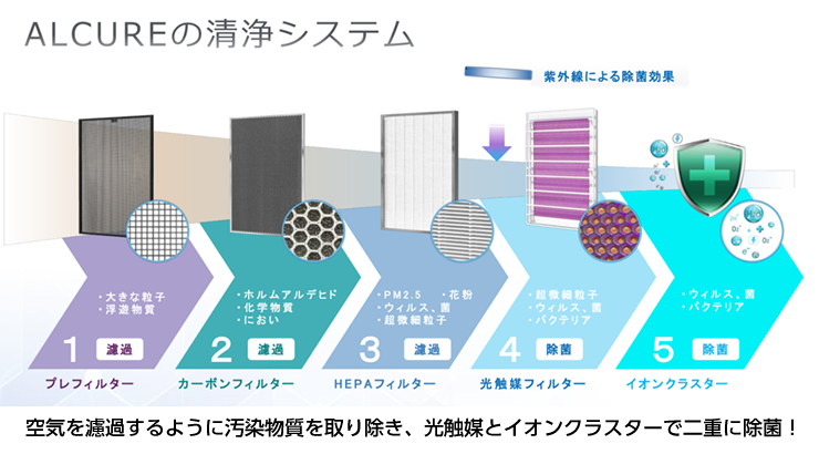 ALCUREの清浄システムは濾過するように丁寧に汚染物質を取り除き、2度重ねて除菌するクリーンにこだわった清浄システム。