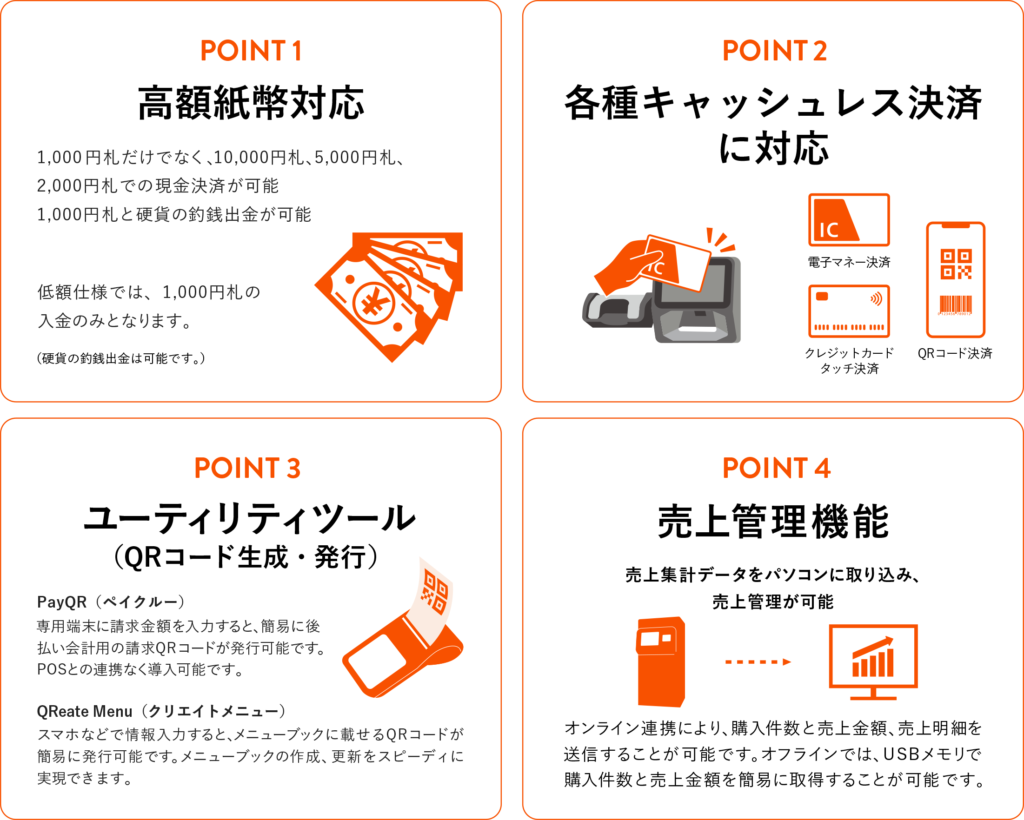 高額紙幣の取り扱いやキャッシュレス決済にも対応しており、多様な支払い方法をカバー。