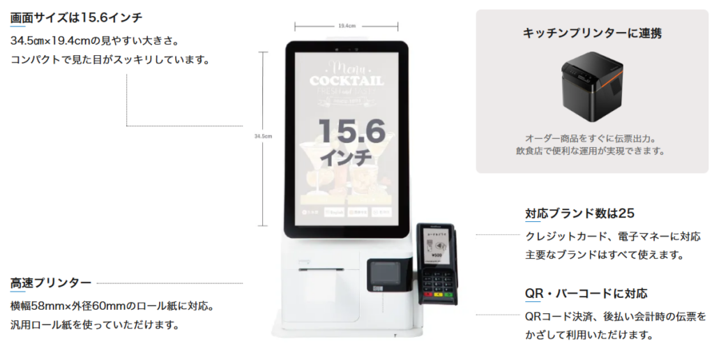 セルフレジはスタッフが操作するわけではないため、よりわかりやすい表示が必要です。 ViSA,Master,JCBなどのクレジットカード、 Paypayを始めとしたQRコード、Suicaなどの交通系ICなど、 幅広く対応しています。最短での納期は約1ヶ月。