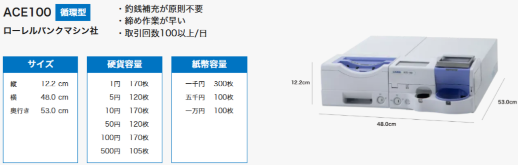 釣銭機は「循環型」で、予めご用意いただいた釣銭と、お客さまが投入したお金は一括管理され釣銭としても再利用できます。取引数(1日)が100を超えるお客さまはこちらがお勧めです。
